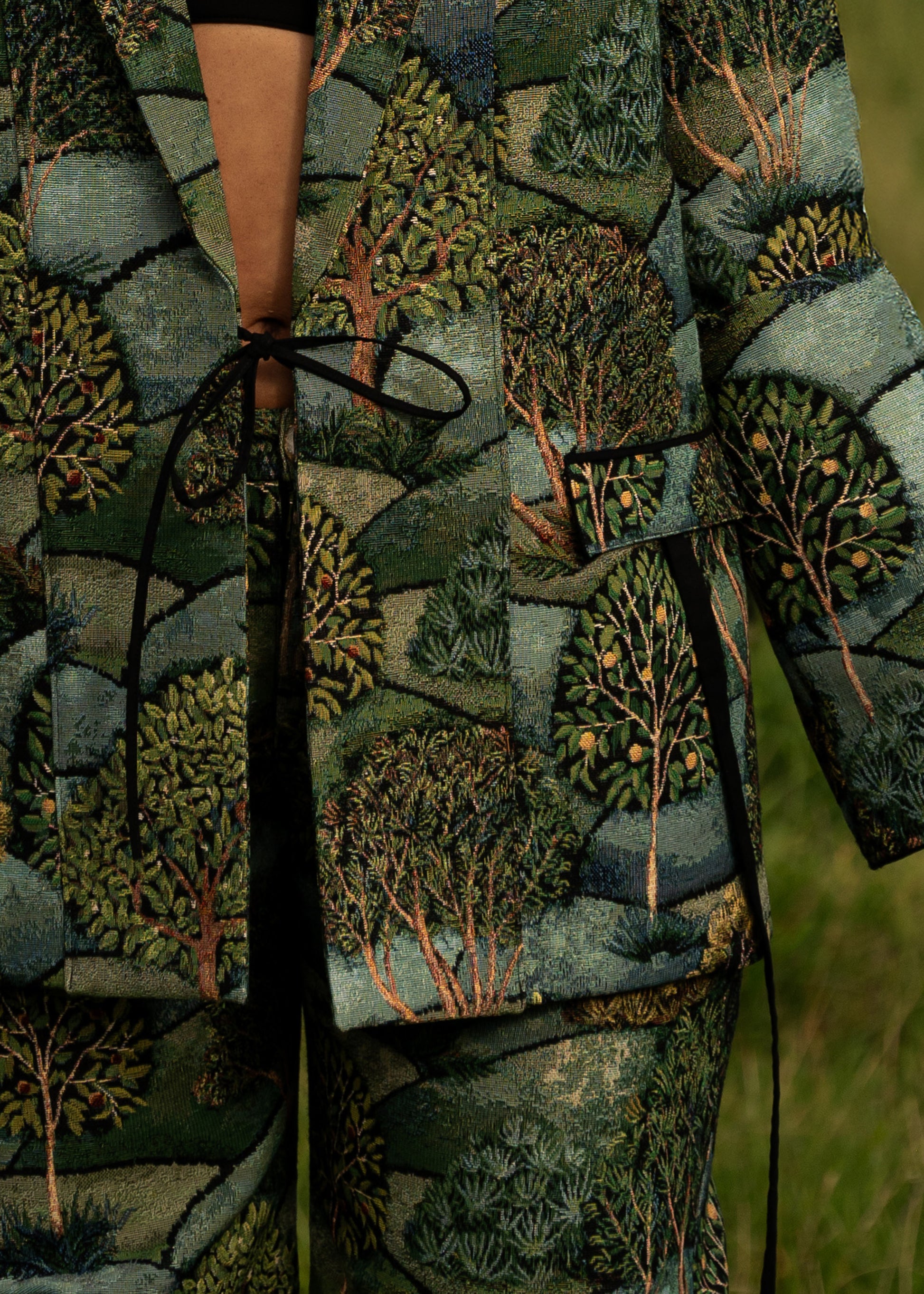 the fabrics depth and texture evoke the secret gardens hidden within the city- a core motif of the URBAN FAIRY capsule collection. finished with precise lapels, discreet closure, and elongated ribbon details, it moves between structure and fluidity, offering both presence and poetry.